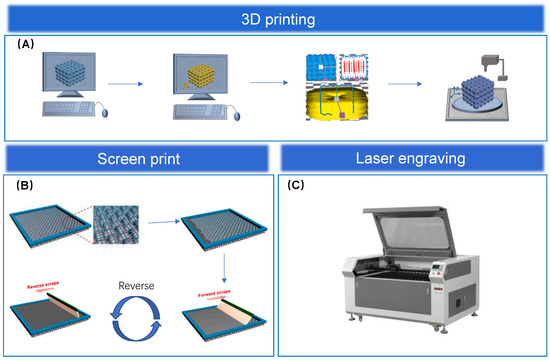 (A) Schematic illustration of the 3D printing process. Reprinted with permission from Elsevier [93]. (B) Schematic illustration of the screen-printing process. Reprinted with permission from Elsevier [94,95,96]. (C) Laser engraving machine.
