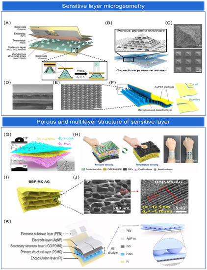 (A) Schematic illustration of stimulus−discriminating and linearly sensitive bimodal electronic skin (E−skin) and SEM images of a spray−coated rGO thermistor. Reprinted with permission from John Wiley and Sons [152]. (B) Structure diagram of a porous pyramid dielectric layer (PPDL). Reprinted with permission from the American Chemical Society [138]. (C) The top view and scanning electron microscopy SEM images of the PPDL. Reprinted with permission from the American Chemical Society [138]. (D,E) Photographs and SEM images showing the highly uniform micropillar array and flexible and ultrathin device. Reprinted with permission from the American Chemical Society [155]. (F) The sensor architecture. Mechanical damages such as cuts or scratches do not affect the sensing performance. Reprinted with permission from the American Chemical Society [155]. (G) Schematic illustration of the three−dimensional network structure of the all−nanofiber TENG−based e−skin. The images of the water contact angle and molecular structure of poly(lactic−co−glycolic acid (PLGA) and PVA are inserted on the top left and lower left, respectively. The surface SEM image of the AgNWs electrode is inserted on the lower right. Reprinted with permission from the American Association for the Advancement of Science [159]. (H) Schematic diagram of dual−model textile for pressure and temperature sensing and optical photographs of the front side and reverse side of electronic skin textile (4 × 4 pixels) conformably attached on an arm. Reprinted with permission from Elsevier [180]. (I) Illustration of the structure of Bottle Brush PDMS−MXene−aerogel (BBP−MX−AG). Reprinted with permission from Springer Nature [160]. (J) SEM image of BBP-MX-AG and images showing nanochannels with an interlayer spacing of 1.8 nm in the cellular wall of BBP−MX−AG. Reprinted with permission from Springer Nature [160]. (K) Schematic diagram of the hierarchical branching (HB) sensor, which contains two hemisphere−structured layers and a side−by−side electrode layer. The reduced graphene oxide (rGO) sheets coated on the secondary layer form a wrinkled morphology on the surface of elastic PDMS, serving as the tertiary layer. Reprinted with permission from Elsevier [181].