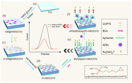 Illustration of preparation process of BSA/Apt/O-VMSF/ITO electrochemical aptasensor and AFB1 assay. (a) Bare ITO electrode. (b) Binary assembly consisting of SM and VMSF on the ITO glass. (c) GOPTS bearing epoxy groups functionalized VMSF/ITO. (d) Removal of SM. (e) Modification of AFB1-specific aptamer and blockage of non-specific binding sites using BSA. (f) Detection of AFB1 with the help of Ru(NH3)63+ in the bulk solution.