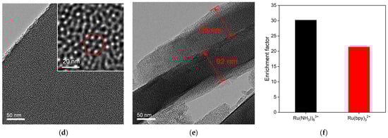 In order to understand the morphology and properties of the prepared VMSF, electron microscopes and electrochemical methods were employed. As shown from the cross-sectional SEM image in Figure 2c, the VMSF with homogeneous thickness of ~90 nm is observed on the top of the ITO coated glass. Top-view TEM images show that the nanopores of the VMSF are closely oriented in a hexagonal arrangement, and their diameter is about 2~3 nm (Figure 2d). The cross-sectional TEM image also reveals the parallel nanochannels of about 90 nm in thickness (Figure 2e). Then, three electrochemical redox probes with different characteristics, namely Fe(CN)63− (electronegativity), Ru(NH3)63+ (electronegativity), and FcMeOH (neutrality), were selected to examine the integrity and charge permselectivity of the VMSF by using the cyclic voltammetry (CV) method. As shown in Figure S1 in Supplementary Material, the templated SM filled in the vertical silica nanochannels prohibits the access of charged probes (Fe(CN)63− and Ru(NH3)63+) to reach the underlying ITO electrode surface, eventually blocking their electron exchange on the electrode surface. However, the ingress of neutral FcMeOH into the silica nanochannels is unhindered, indicating that silica nanochannels attached to the ITO surface are fully filled with SMs and further confirming the intact VMSF on the ITO surface. After SM exclusion, an apparent charge permselectivity is displayed at the VSMF/ITO electrode compared with that of the bare ITO electrode, electrostatically attracting Ru(NH3)63+ and repelling Fe(CN)63−, which is attributed to the deprotonation of numerous silanol groups on the inner surface at pH 7.4 (the reported pKa of silanol groups on the silica nanochannel surface is about 3) [45]. On the basis of the above electrostatic effect, an amplified electrochemical signal is generated for Ru(NH3)63+ and a depleted signal for Fe(CN)63− at the VMSF/ITO electrode, in comparison with that of the bare ITO electrode. Figure 2f and Figure S2 compare the electrostatic enrichment capacity of VMSF/ITO toward Ru(NH3)63+ and [Ru(bpy)3]2+. As seen in comparison with the bare ITO electrode, VMSF/ITO displays the amplified electrochemical signals for both [Ru(bpy)3]2+ and Ru(NH3)63+ with positive charge, which is attributed to the deprotonation of silanol groups on the inner surface. Furthermore, VMSF/ITO shows a higher enrichment factor for Ru(NH3)63+ compared with [Ru(bpy)3]2+. Therefore, Ru(NH3)63+ was chosen as the electrochemical probe in this study. In addition, as the half-wave width of the DPV curve represents the electrochemical behavior and reaction rate of the electroactive molecules, the DPV curves of bare ITO and VMSF/ITO electrodes in PBS solution containing 100 μM Ru(NH3)63+ are recorded in Figure S3. As shown, the half-wave width of the DPV curve obtained at the VMSF/ITO electrode is 20 mV lower than that of bare ITO, indicating the faster electrochemical reaction rate of Ru(NH3)63+ at the VMSF/ITO electrode and further confirming the electrostatic enrichment capacity of the VMSF bearing negative charge.