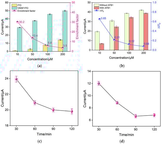 (a) Anodic peak currents of Ru(NH3)63+ with different concentrations at the bare ITO and VMSF/ITO electrodes (bar graphs) and enrichment factors for Ru(NH3)63+ by VMSF/ITO (point plot). (b) Anodic peak currents (bar graphs) and current variation ratio (point plot) obtained at the BSA/Apt/O-VMSF/ITO electrodes before and after incubation with 300 ng/mL AFB1 in PBS solution containing different concentrations of Ru(NH3)63+. Optimization of incubation time for aptamer (c) and AFB1 (d). Error bars represent the standard deviation of the results measured in three parallel experiments.