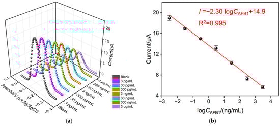 (a) DPV curves of BSA/Apt/O-VMSF/ITO aptasensor in presence of different concentrations of AFB1 (3 pg/mL–3 μg/mL). (b) Corresponding calibration curve.