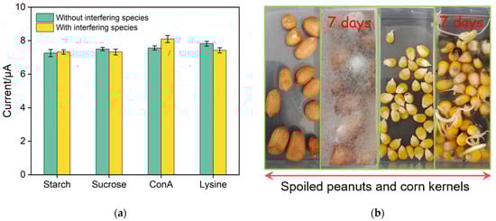 (a) DPV signal values of BSA/Apt/O-VMSF/ITO electrodes after incubation with 300 ng/mL AFB1 with or without 1 mg/mL of different interfering species. Error bars represent measurement errors from three experiments. (b) Photographs of peanut and corn kernels before and after culturing in humid and sultry environment for 7 days.