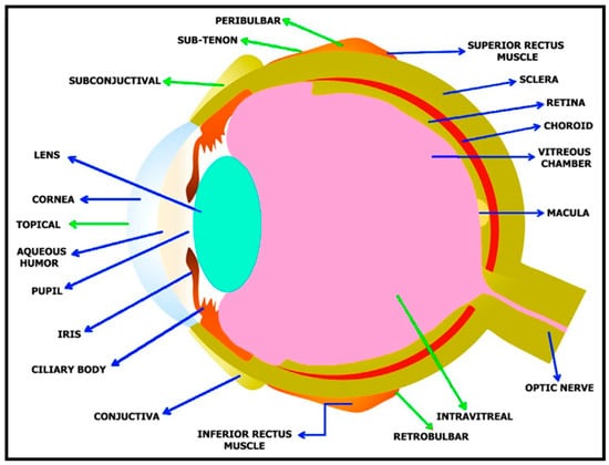 Structure of human eye. Blue arrows denote different structures of human eye and green arrows denote various routes of drug administration. Reprinted from Ref. [29].