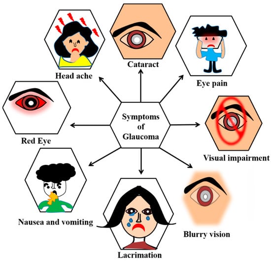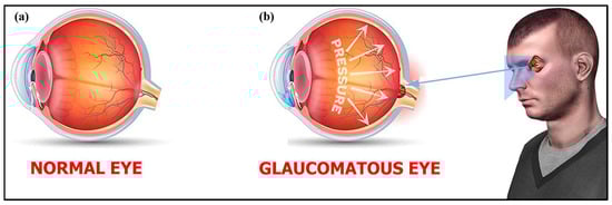 Glaucoma (Figure 4 and Figure 5) is a term given to a group of ocular disorders that is characterized by impaired optic nerves, resulting in progressive loss of vision. The persistent rise in intraocular pressure (IOP) is the most significant hallmark of this disease [46]. Glaucoma is the main reason for blindness among the global population. Increased IOP damages the optic nerves and causes a loss of retinal ganglion cells (RGCs) [47,48]. The three stages of glaucoma are early, advanced and extreme glaucoma (Figure 6). Around the world, 64.3 million people are presently affected, and it is supposed that in 2040 there will be 112 million people suffering from glaucoma [47]. Hence, glaucoma diagnosis and monitoring are very essential, and can be achieved by measuring the IOP [49]. In affected individuals, both retinal ganglion cells and retinal axons become damaged due to high levels of IOP and oxidative stress [50].