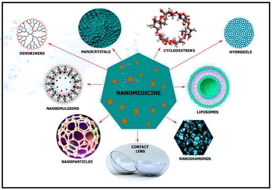 Nanotechnology is the development and application of materials (Figure 10), machines or systems with nanometer-scale dimensions [57]. Currently, this area is experiencing rapid expansion within several streams. This technology is expected to achieve greater advancements and play a crucial part in numerous biological applications, including molecular imaging, biosensing drug delivery and disease diagnostics [58]. In the past 20 years, exceptional research has been carried out using nanoscale materials for the betterment of mankind. Nanomaterials are well known for their high surface area, enhanced reactivity, and distinctive mechanical and optoelectronic properties. These properties have been utilized for significant advancements in a variety of industries, including electronics, medicine, food, cosmetics and energy devices [59]. These various advancements in nanotechnology have led to the fabrication of flexible and sensitive nanosensors for biomedical applications. The goal of nanosensors is to identify and quantify any chemical, mechanical and physical alterations linked to a specific marker that plays a vital role in disease development [60]. Graphene is used for biological applications such as biosensing, bioimaging, drug administration, phototherapy and tissue engineering because of its distinctive electrochemical, optical and mechanical capabilities [61]. Mesoporous silica nanoparticles (MSNs) have proven to be highly helpful in a variety of applications, including sensors and catalysis. More significantly, MSNs are used as drug delivering vehicles because of their surface area, surface functionality and biocompatibility [62]. Because of their oxygen permeability, flexibility, transparency, high water content, capacity to load drugs and good biocompatibility, hydrogel-based contact lenses are becoming more popular in the field of ophthalmology [37]. Liposomes are lipid-based spherical vesicles made up of cholesterol and phospholipids. They may be used to encapsulate both hydrophilic and hydrophobic medicines in a single system and are biocompatible, biodegradable and non-toxic. Several efforts have been undertaken to increase the bioavailability, stability, corneal penetration and targeted drug delivery of liposomes [4]. Nanofibers are fibers made of polymers that are in the nanometer size range. Electrospun nanofibers for the regeneration of soft tissues have gained a lot of interest due to their distinctive composition and structural characteristics. The three-dimensional architecture, composition, morphology, biological functions and specific optical, magnetic and electric properties of electrospun nanofibers can be easily controlled based upon the application [63]. A type of molecular aggregation called a polymer micelle is caused by non-covalent bond interactions between several polymer chains. The formation of polymer micelles depends upon specific interactions between the polymers, temperature and pH of the polymer solution used during the synthesis of micelles [64]. Dendrimers are a unique family of macromolecules with a highly branched, three-dimensional architecture and a definite shape and size. They possess a central core and dendritic branches made up of hydrophobic and hydrophilic moieties [65]. The fact that dendrimers may accommodate several molecules inside them or on their surfaces gives them an advantage over linear polymers in synthesizing multifunctional nanoconjugates [66]. The core, dendron and terminal functional groups are the three different components that make up dendrimer molecules [67]. The remarkable electrical and optical properties of gold and other noble metal nanoparticles (NPs) are used for different types of applications in the field of biomedicine, such as molecular disease diagnosis/imaging, drug delivery and the development of biosensors. Contact lenses loaded with gold nanoparticles were used to study their role in improving the amount of the drug timolol, which is widely used for treating glaucoma [68].