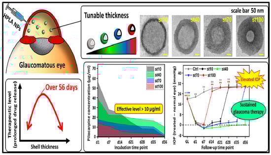 Nguyen et al. prepared hollow poly (lactic acid) nanoparticles and studied the role of shell thickness in the sustained release of antiglaucoma drugs (Figure 11). Pilocarpine-loaded hollow poly (lactic acid) nanoparticles with a thickness from about 10 to 100 nm proved to be non-toxic to human lens epithelial cells and rabbit eyes. Thick shells from 70 to 100 nm showed sustained release of the drug pilocarpine with reduced drug loading efficacy. Moderately thick shells with a thickness of about 40 nm showed sustained release of pilocarpine for up to fifty-six days. This formulation also proved to alleviate ocular hypertension for over fifty-six days when tested on an in vivo rabbit model. The results demonstrated the role of shell thickness in the long-term delivery of antiglaucoma drugs [80].