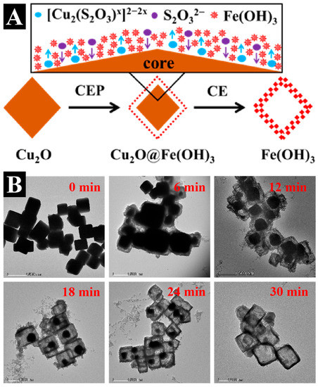 (A) Schematic diagram of Fe(OH)3 nanocages by the coordinating etching principle, CEP, coordinating etching and precipitating; CE, coordinating etching. (B) TEM images of the time-dependence of Fe(OH)3 nanocages for different times.