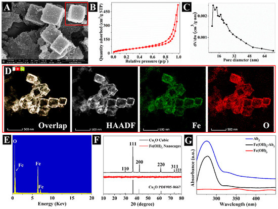 (A) SEM, (B) N2 absorption–desorption isotherm, (C) pore size distribution, (D) elemental mappings, (E) EDS, and (F) XRD of Fe(OH)3 nanocages. (G) UV–vis spectra of Fe(OH)3@Ab2.