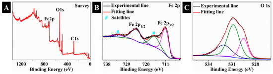 XPS survey (A), and the deconvolution of Fe 2p (B) and O 1s (C) of Fe(OH)3 nanocages.