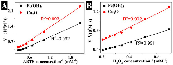 The peroxidase-like behaviors of the Fe(OH)3 nanozyme were studied by varying the concentrations of ABTS at a certain concentration of H2O2 or varying concentrations of H2O2 at a certain volume of ABTS. As seen from Figure 4A,B, the kinetic parameters of Fe(OH)3 nanozyme and Cu2O were calculated by the Lineweaver–Burk plots, indicating that Fe(OH)3 presented a lower Km (0.7 mM) than that of Cu2O (0.77 mM) and horseradish peroxidase (HRP) (0.81 mM) [40]. Therefore, Fe(OH)3 exhibited a stronger affinity for ABTS and H2O2.