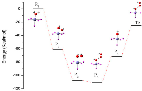 Fe(OH)3 catalyst reaction mechanism and energy change (insets are the structure of relevant molecules (ions); the center is iron ion, purple is ghost atom, red is oxygen atom, and white is hydrogen atom).