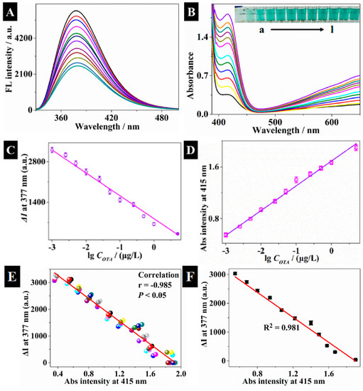 Fluorescence spectra (A) and UV–vis spectra (B) for different concentrations of OTA, (a) 0, (b) 0.001, (c) 0.0025, (d) 0.005, (e) 0.01, (f) 0.025, (g) 0.05, (h) 0.1, (i) 0.25, (j) 0.5, (k) 1, and (l) 5 μg/L (from bottom to top in A and B correspond to a–l, respectively). Inset in B was the photographs of the colorimetric method at different concentrations of OTA. (C,D) Calibration curve based on the fluorescence spectra (A) and UV–vis spectra (B), respectively. (E,F) Pearson correlation analysis of the self–tuning immunosensor (E) and corresponding calibration curve (F).