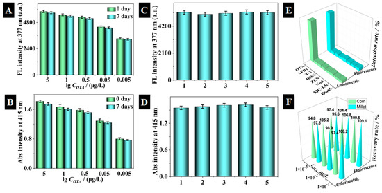 As for the actual application, an immunosensor should be not only sensitive but also stable and reproducible. Hence, to investigate the stability of the proposed sensor, as depicted in Figure 7A,B, the long-term stability of the strategy was evaluated with the same immunosensor using five OTA concentrations. After a week of storage, the fabricated sensor can retain sufficient stability for the detection of OTA. Subsequently, the reproducibility of the strategy was also demonstrated by employing five independent immunosensors with the same concentration of OTA (Figure 7C,D). As for colorimetric or fluorescence detection, there is basically no difference between five sensors, which demonstrated that the designed self-tuning immunosensor exhibited desirable stability and reproducibility for OTA detection.