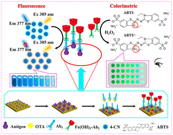 Schematic illustration of the self–tuning dual–mode immunosensor for OTA detection: fluorescence and colorimetry.