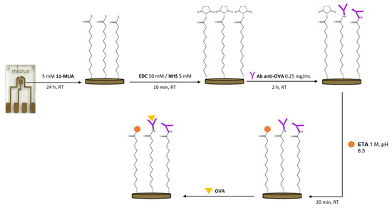 Schematic diagram of the immunosensor fabrication. Gold thin-film electrochemical sensors (ED-SE1-Au) were treated sequentially with 11-MUA, a mixture of NHS and EDC, a solution of pAb anti-OVA, and ETA. The immunosensor was tested at different concentrations of OVA.