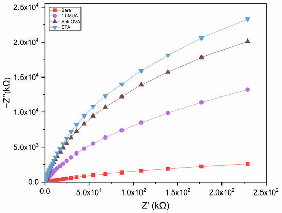 The pAbs anti-OVA were covalently immobilised on an 11-MUA-modified gold surface SAM (Section 2.4). The electrode derivatisation for the immunosensor assembling was monitored using non-Faradaic electrochemical impedance spectroscopy (EIS), characterised by resistive and capacitive contributions. A non-Faradaic system directly detects the analyte without needing a redox probe, such as a ferrocyanide–ferricyanide redox couple (Fe (CN)63−/4−). As a result, the experimental process turns out to be more manageable and suitable for rapid monitoring.
