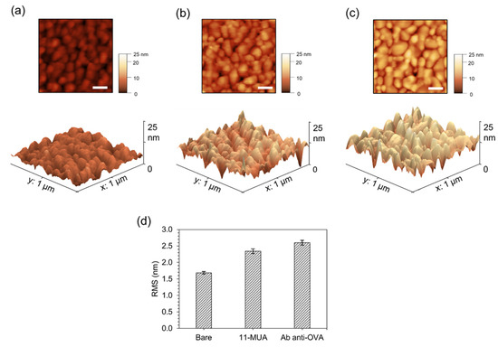 Since the electrochemical response depends on the morphological characteristics of the surface electrode, AFM is useful to evaluate the immobilisation of the pAbs anti-OVA on the impedimetric immunosensor. In this respect, the root mean square (RMS) value of the height irregularities was chosen to characterise the immunoassay surface roughness [31]. The following AFM analysis was carried out on the same chip at different stages of the pAb anti-OVA immobilisation process to avoid the fluctuations of the surface roughness due to the inter-batch variability of the electrochemical surface sensors. Figure 4a illustrates the AFM morphology map of 1 μm 1 μm in size acquired on the working area of the bare gold-based electrode. The surface of the electrochemical sensor was characterised by a low roughness (RMS = 1.7 ± 0.1 nm) and showed the typical granular structure, consisting of nearly spherical nanoparticles, which was strictly connected to the gold deposition process parameters used by Micrux manufactory [32]. The sensor was, then, functionalised with an 11-MUA SAM, as described in Section 2.4. The evidence that the gold surface was chemically modified was emphasised by the significant change of the surface roughness (RMS = 2.3 ± 0.1 nm) as observed in the AFM morphology of the surface (Figure 4b). Finally, in Figure 4c is shown the AFM morphology map of the 11-MUA-modified gold surface after the incubation of the pAbs anti-OVA. As highlighted in the bar plot of Figure 4d, the deposition of the consecutive layers on the electrode affected the RMS value of the surfaces. In particular, the increment of the RMS value of the pAb anti-OVA surface (2.6 ± 0.1 nm) compared to the 11-MUA-modified gold surface and the bare electrode surface was comparable to the roughness change detected in similar studies [33,34]. The AFM results further assessed the complete immobilisation process of the pAbs anti-OVA as also confirmed by the impedimetric experiments.