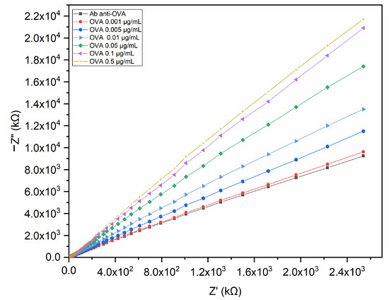 The electrochemical performance of the immunosensor was examined by non-Faradaic EIS for detecting OVA dissolved in PBS. Unlike the Faradaic approach, a non-Faradaic response shows high impedance values given that no redox species assist the charge transfer between the interfacial layers [35]. The impedance response was recorded starting from the lowest (0.001 μg/mL) to the highest (0.5 μg/mL) concentration of OVA. The insulating effect of the sensing surface and the OVA binding on the modified electrode generated variations in the double-layer capacitance (Cdl). The binding phenomena occurring at the electrode interface can be observed in the Nyquist plot as an increase in the imaginary part of impedance at increasing OVA concentrations (Figure 5).