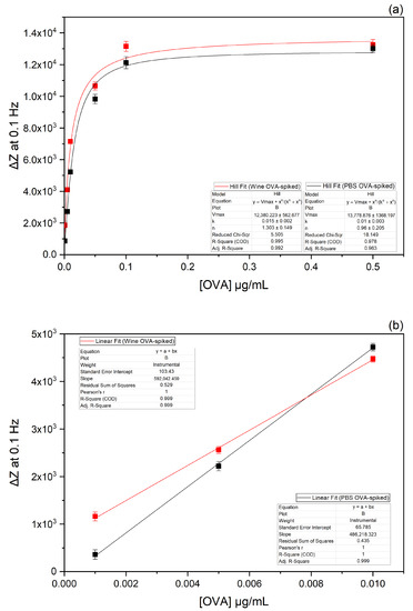 Plots of the change in impedance (ΔZ) at 0.1 Hz versus OVA concentration dissolved in PBS (in black colour) and OVA concentration in spiked white wine (in red colour). The binding curves were obtained through a non-linear fitting function (a). The calibration curves of the immunosensor were obtained through a linear fitting function (b).