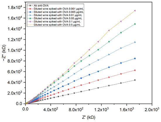 In order to explore the application of the immunosensor on a real matrix, impedance measurements were conducted on white wine diluted in PBS and spiked with different concentrations of OVA (0.001, 0.005, 0.01, 0.05, 0.1, and 0.5 μg/mL) as described in Section 2.7. The impedimetric response of the electrode reported in Figure 7 displays that the immunosensor was able to detect OVA even in wine.
