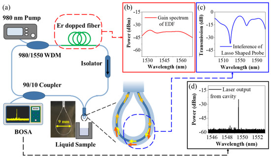 Illustrations of the sensing element and the sensing system of the fiber laser-based lasso-shaped sensor. (a) Interrogation setup of fiber laser-based lasso-shaped biosensor; (b) Optical signal around 1550 nm generated by erbium-doped fiber under the excitation of 980 nm light; (c) The transmission spectrum of a wideband light source of 1490~1610 nm passing through the lasso structure; (d) The laser signal with narrow linewidth output from the laser cavity.