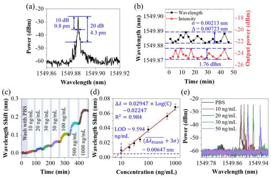 Figure 6e shows the laser spectra of our fiber sensor in CEA protein solutions with concentrations varying from 10 ng/mL to 50 ng/mL after being sufficiently combined. Thanks to the narrow linewidth characteristic of the laser spectrum, small shifts in the laser spectrum, even as small as 0.01 nm, were easy to distinguish. This is exactly the advantage of laser demodulation. In some published papers, despite the high RI sensitivity of the sensor, the spectrum used for signal demodulation was very flat, and it was difficult to resolve small spectral shifts, which severely limits the LOD of the sensor [49]. In this work, although the RI sensitivity of our sensor was not high, based on the narrow linewidth and high-resolution characteristics of the laser spectrum, our design still showed good detection ability.