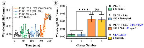 To prove the specificity of the probe, we utilized two kinds of non-specific proteins— PLGF and BSA—and designed three different proportions of protein PBS solution as controls. The first was to configure lyophilized PLGF with PBS buffer to a concentration of 500 ng/mL. In the second group, PLGF and BSA were added to the PBS buffer, and the concentrations of both were 500 ng/mL. In the last group, CEACAM5 protein with a concentration of 50 ng/mL was added to PLGF and BSA mixture solution. The sensing probe was sequentially immersed in three different solutions for 45 min. Before and after each test, the surface of the probe was immersed in PBS buffer for washing the biological residues. Figure 7a shows the variation of laser wavelength during the whole biological testing period. In the previous two controls, the fluctuation range of laser wavelength was significantly larger than that in pure buffer (0~35 min) due to the random movement of biomolecules and moving close to the fiber probe. However, because these biomolecules did not match the anti-CEACAM5 antibody on the surface of the sensor, this increase in laser wavelength (non-specific binding) fell back after washing in PBS buffers (80~90 min and 135~145 min). However, after the third test group, the laser wavelength (195~205 min) increased significantly by about 0.02 nm, which demonstrated the specific binding of CEACAM5 protein in this mixture solution. Three independent tests were repeated to get the mean wavelength drift and error bar.