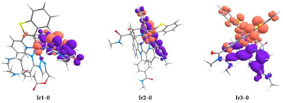 We also carried out quantum chemical calculations, which included optimization of the ground state structure (as an example, the optimized structure of the Ir1–0 complex is shown in Figure 1). Note that for the sake of simplicity in the optimization procedure, we used a model structural pattern, which differs from the structures of the Ir1–Ir3 compounds in that oligo(ethylene glycol) groups were replaced by methyl substituents to reduce the calculation time. It should be noted that such substitution is reasonable, since neither oligo(ethylene glycol) nor methyl substituents noticeably affect the central core structure and photophysical characteristics, being remote from the chromophoric center and having a similar nature from the viewpoint of donor–acceptor properties. The optimized structures for the Ir2 and Ir3 complexes are shown in Figures S22 and S23 in the Supplementary Materials. The obtained characteristics of the optimized structures (ligand disposition in the coordination octahedron, bond lengths and angles) are not exceptional and fit the structures of closely analogous complexes well, synthesized and characterized previously [68,69,70]. The obtained structural parameters of the optimized patterns are summarized in Tables S9–S11; see Supplementary Materials. It is also important to note that the optimized structural motifs of Ir1–Ir3 are in complete agreement with the data of proton NMR spectroscopy in terms of the ligand environment symmetry and intramolecular non-bonding proton contacts observed in the NOESY spectra, which additionally confirm the correctness of the complexes’ composition and structure determination by this method.