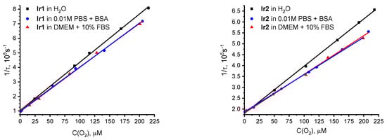 The noticeably higher phosphorescence quantum yields of Ir1 and Ir2, as well as their high sensitivity to the variations in molecular oxygen concentration in solution, led us to choose these compounds for the further studies of their sensor properties and their applicability as luminescent oxygen probes in biosystems. To calibrate the dependence of Ir1 and Ir2 excited state lifetimes on oxygen concentration, we carried out the measurements in water and in model biological solutions containing typical components of intracellular media: PBS buffer with the addition of bovine serum albumin—BSA and DMEM with the addition of 10% fetal bovine serum—FBS; see Table 1 and Figure 4. The experiments in the model solutions make it possible to reveal the effect of salinity, pH and the presence of the main protein component of plasma (albumin) on the sensors’ characteristics. The obtained data (Table S1) indicate lifetime independence on pH and media salinity. Aqueous solutions were studied for comparison.