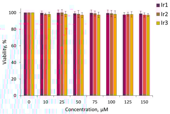 MTT assay for viability of CT26 cells after incubation with Ir1–Ir3 complexes. Mean ± SD. N = 3 repeats by 10 wells.
