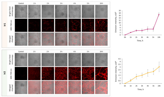 Next, the ability of Ir1, Ir2 and Ir3 to accumulate in living cancer cells was investigated. As mentioned above, Ir3 featured a very low-emission quantum yield that gave an extremely weak luminescence signal inside cells, thus making this complex unsuitable for further biological testing. Using laser scanning microscopy, it was shown that Ir1 and Ir2 successfully penetrated into cultured cancer cells (Figure 6); the phosphorescence intensity of both complexes increased stepwise in the time period from 1 to 24 h of incubation. Complex Ir2 displayed more intense luminescence compared to Ir1 under normoxic conditions, due to a higher extinction coefficient at 405 nm (excitation wavelength in cell internalization experiments). Inside the cells, the complexes were distributed heterogeneously as granules in the cytoplasm and also as a homogenous fraction in the cytosol.