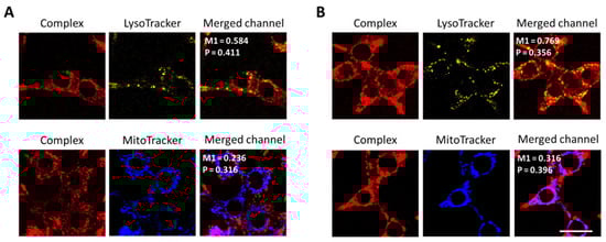 Colocalization of Ir1 (A) and Ir2 (B) complexes with cell organelles. The signal of the complexes was detected in the range 600–740 nm, lysosomes were visualized using a LysoTracker Yellow HCK-123 (detected in the range 520–570 nm) and mitochondria with MitoTracker 405 Blue (detected in the range 420–470 nm). The figures show the Pearson (P) and Manders (M1) colocalization coefficients. Scale bar = 20 µm.