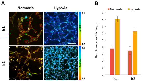 Phosphorescence lifetime variations of Ir1 and Ir2 complexes in CT26 cells upon modeling of hypoxic conditions in vitro. (A). Representative PLIM images of cells in normoxia and hypoxia. Scale bar = 50 µm. (B) Quantification of the phosphorescence lifetime in the cell cytoplasm. Mean ± SD, N = 50 cells.