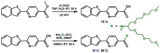 To impart water solubility, biocompatibility and low toxicity to the target compounds, as well as to protect them from nonspecific interactions with biomolecules, we introduced short-branched oligo(ethylene glycol) substituents into the structure of the cyclometallating and diimine ligands. The scheme of the corresponding modification and obtaining a new N^C ligand is given below (Scheme 1), while the modification reactions of the corresponding N^N ligands are described in the previous literature [52,60,62].