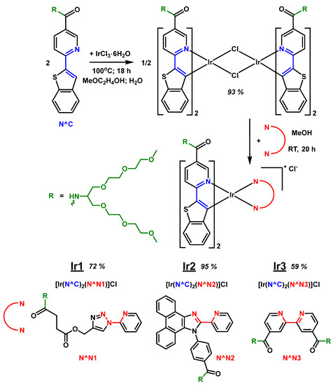 Scheme of synthesis of new Ir(III) dimer [Ir2(N^C)4Cl2] and new complexes Ir1–Ir3.