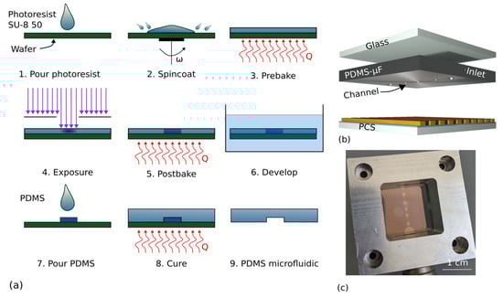 We combined microfluidics based on poly(dimethylsiloxane) (PDMS) with PCS in order to obtain low-cost microfluidic biochips. PDMS is known to be a good molding material with high malleability [,]. We used a two-step process. The first step involved the fabrication of the mold via a lithographic process on a 6-inch silicon wafer. The second part of the process used the mold to form microfluidic channels. The process is shown in Figure 2a.