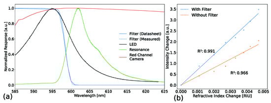 (a) Spectral response of the employed optical components. The four overlaying spectra depict the behavior of the cut-off filter, the light emitting diode (LED) spectrum, the guided-mode resonance (GMR) of the photonic crystal slab, and the red channel response of the camera. The plots are normalized for easier visual understanding. The intersection of the LED, transmission behavior of the filter, and the red channel camera response form the system response. The dashed blue line shows the measured filter behavior. (b) Detected intensity changes from a refractive index sweep performed with and without a filter. The changes are shown as positive to facilitate visual perception.