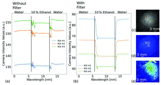 Effect of the cut-off filter on the sensitivity of the intensity-based camera setup (IBCS). The measurements were conducted consecutively, without changing the photonic crystal slab orientation. The cut-off filter was simply introduced. The setup was used in transmission. The regions of interest (ROIs) are the same for both experiments. The camera intensity values range from 0 to 255. (a) Red channel intensity change for a photonic crystal slab without a cut-off filter. (b) Red channel intensity change for a photonic crystal slab with the cut-off filter introduced. (c) Sample image with the corresponding ROIs. (d) Logarithmically enhanced difference image during exposure to 10% ethanol without the cut-off filter. (e) Same as (d) but with the cut-off filter inserted.