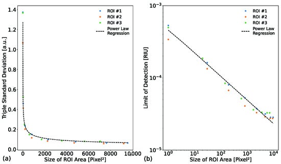 As mentioned above, the advantage of this setup is that little postprocessing is necessary, as the intensity values of the camera image are directly averaged within the ROIs. However, the size of the ROI influences the noise level, as each pixel functions as a sample point. By increasing the ROI size, the noise is decreased and in turn the LOD is increased. This behavior is shown in Figure 5. In Figure 5a, we illustrate the observed triple standard deviation for different ROI sizes. The distribution of the triple standard deviation follows a power law distribution. As the noise directly influences the LOD, we plotted the obtained LOD for different ROI sizes in Figure 4b. By changing the scale for the x and y axis to a logarithmic scale, the power law is displayedas a power law regression line, which facilitates reading.. The figure shows that with increasing ROI size the LOD also improved. At greater ROI sizes, the obtained LOD differs more from the power law regression line. This is due to the inhomogeneous sensitivities of the PCS surface []. This behavior should be considered when designing a microfluidic layout for a camera-based detection setup. Here, for an LOD below 10−4, a ROI of at least 100 pixels should be taken.