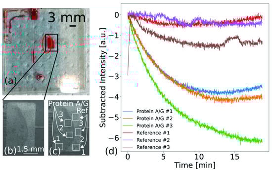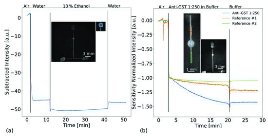 In order to evaluate the ability of the setup for biosensing within a microfluidic biochip, we immobilized GST protein on the surface of the PCS. The results of this are shown in Figure 6b. A video of this measurement is shown in the Supplementary Information Video S2. For immobilization, we placed a 1 µL droplet of 100 µg/mL GST protein in the round chamber. After incubation, we passivated the rest of the surface with bovine serum albumin (BSA) (A2153, Sigma Aldrich, Taufkirchen, Germany). After degassing the microfluidic biochip for 30 min, we added GST antibodies diluted by a factor 1:250 in Dubelcco’s phosphate buffered saline (DPBS) (D8537, Sigma-Aldrich, Taufkirchen, Germany) at the entrance of the microfluidic channel. It should be noted that the manufacturer of the antibodies does not provide a defined concentration. They state a range of 8–15 mg/mL, as the product is a polyclonal antibody. As we cannot calculate a specific concentration, we simply state a dilution factor. Furthermore, we diluted the sample as we wanted to analyze the behavior in a less concentrated sample to obtain slower reaction kinetics as an initial step. We evaluated the intensity changes for three ROIs and normalized the sensitivity to the induced refractive index step from air to DPBS. This compensates local sensitivity dependencies and allows the signals to be compared. Figure 6b shows that a change of intensity in the shape of a biological binding curve was detected in the area where GST proteins were immobilized []. This behavior was also visible for the two reference ROIs, although it was a lot less prominent. This indicates unspecific binding to the passivated surface and is a common phenomenon in biosensing. Introducing polyethylenglycols (PEG) to surfaces is a promising approach to suppress unspecific binding in biosensors []. Recently, we have shown that it is possible to immobilize aptamers to functionalized surfaces containing PEG molecules and aim to use this functionalization route for future biosensors []. After approximately 17 min, we applied 10 µL of pure DPBS. This stopped the binding behavior of the GST antibodies, indicating that a true binding of GST antibodies was detected.