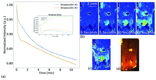 The results are shown in Figure 7. The measurement was performed in reflection. Differing from the previous measurements, we used wingflow cannulas for the inlet and outlet of the liquid. The chamber was initially filled with DPBS and we injected a concentration of 2.9 µg/mL streptavidin diluted in buffer. The intensity change was recorded in three ROIs and is shown in Figure 7a. The inset displays the normalized data for the three ROIs individually. Unfortunately, there was a scattering entity brightly visible in the area of functionalization spot #1 that prevented full detection underneath. Two ROIs were chosen for evaluating the binding of streptavidin and one for referencing, as is visible in Figure 7c. The two curves of the main plot were obtained by dividing them by the reference signal. The two streptavidin ROIs showed a large change of intensity directly after exposure to streptavidin. This is an expected behavior. However, a background drift was also observed, which is shown by the green referencing line. Without the additional visual information, the understanding of the behavior would be impaired. Yet, using the spatial information, the signals of the streptavidin ROIs are attributed to true binding. This is underlined by the time series shown in Figure 7b. A video containing the binding event of the logarithmically enhanced difference images is provided in the Supplementary Information Video S3. The two circular binding spots of immobilized BSA-biotin are clearly visible. This was not observed for the referencing ROI. Further, it can be seen that the signal continued to decrease once the referencing area reached a plateau. This was approximately 5 min after streptavidin exposure. This shows that visual information is an aid in understanding the detected behavior and is an advantage of the detection principle.
