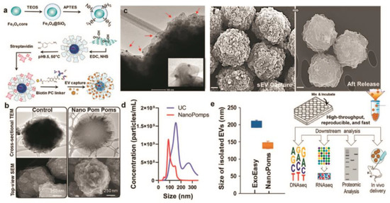 Photo-click chemistry for specific marker capture and release of intact sEVs with the help of 3D-structured nanographene magnetic particles (NanoPoms) with unique flower pom-poms morphology was developed by N. He and co-workers [70]. The results showed improved specificity and sensitivity for detecting urological tumor biomarkers in sEV NanoPoms compared with ultracentrifugation or other bead isolation approaches (Figure 4). A few miRNAs and protein cancer biomarkers highly enriched in urinary sEVs were identified by this method for the first time.