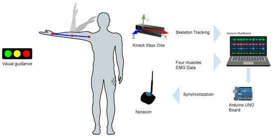 The Noraxon MyoMuscle software was used to record the information from the EMG sensors, each one connected to two disposable disc surface electrodes with approximately 1 cm of separation center-to-center. The PC was running a custom C# code to store the captured information with the Kinect camera.