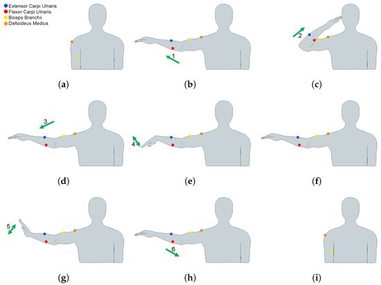 The experiment consisted of two exercises, with ten repetitions for each one, with a total of 20 repetitions per participant and approximately 25 min in total duration. The two proposed upper limb tasks integrated activities derived from exercises that were composed of a series of active and passive upper limb rehabilitation tasks for stroke patients [20]. The phases of the exercises were formulated in order to determine the manipulability indices related to extreme positions of the arm and joint angle variations. A priori, the relationship between the participant’s muscle activity during these exercises and the manipulability indices was not known.