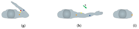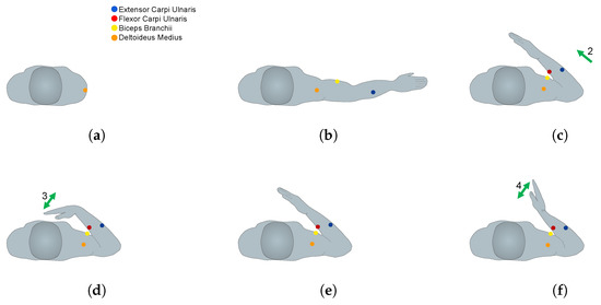 The second exercise (Figure 3) consisted of performing the following movement phases: as in exercise 1, the participant started at a resting position, and then they had to perform an arm abduction (phase 1) movement at approximately 90 degrees. Then, they executed an elbow flexion movement towards the chest (phase 2), performed a wrist flexion with extended hand and returned the wrist and the hand to a neutral position (phase 3). This was followed by a wrist extension with extended hand and then they returned the wrist and the hand to a neutral position (phase 4). Finally, the participant performed an elbow extension (phase 5) and then returned the arm to the resting position.