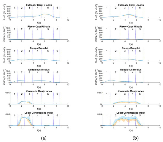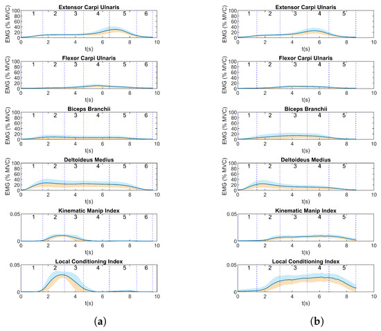 The mean EMG values and manipulability indices of a representative participant are shown in Figure 5a. For exercise 1, the highest values of the KMI and LCI were obtained almost at the beginning of the exercise, with a combination of high activation of the DM and BB, corresponding to phases 2 and 3 of the trial (elbow flexion and extension). As soon as the BB activation started to decrease, the KMI and LCI dropped to a small value. The DM remained active until the return of the arm to a resting position. Regarding the FCU and ECU muscles, when each of them reached the peak activity, both indices remained closer to zero. On the other hand, for exercise 2, the relation between the muscle activity and manipulability indices was not so evident compared to the peaks in muscle activity in exercise 1. On the contrary, similar values of the indices were observed over a longer period than in exercise 1 (Figure 5b).