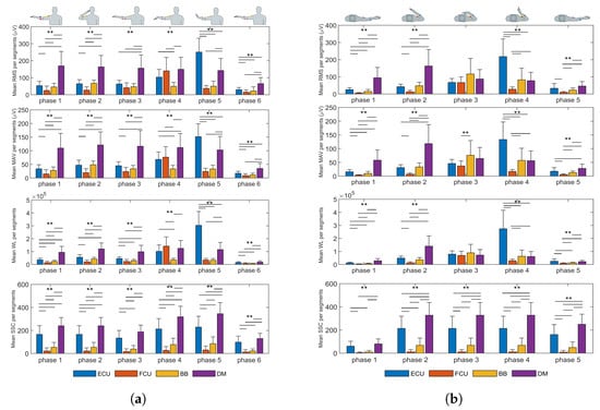 In reference to the results for MAV computation, in exercise 1, the mean activation of DM was higher in phase 1 (109.89 ± 53.92 μV, ), phase 2 (121.02 ± 48.09 μV, ), phase 3 (116.45 ± 57.58 μV, ) and phase 6 (34.97 ± 18.58 μV, ), which correspond to arm abduction, elbow flexion, wrist flexion and arm adduction. In phase 5, the ECU showed higher mean activation than in the other phases (151.69 ± 47.10 μV, ), which was expected because the phase comprised wrist extension. In exercise 2, the scenario was very similar to that of the RMS results.