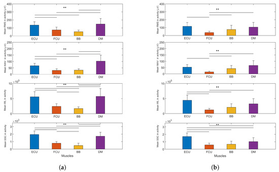 The metrics were also computed on the muscle activity across the whole exercise (see Figure 8). For the RMS, the muscle activity of the DM (149.13 ± 68.85, ) was significantly higher than that of the FCU and BB in exercise 1; the same occurred between the ECU (136.01 ± 40.76, ) and FCU, as well as BB. In exercise 2, the differences between the DM (105.59 ± 60.13, ), ECU (115.79 ± 48.49, ) and BB (76.46 ± 52.68, ) with respect to the FCU were statistically significant. Regarding the MAV, the DM produced the highest mean activity level during both exercises, but only the differences versus FCU and BB were statistically significant for exercise 1, and with respect to the FCU in exercise 2. In both the RMS and MAV, it was shown that the BB was more activated in exercise 2 than in exercise 1. With respect to the WL, in exercise 1, it also could be observed that the DM reached higher levels across the whole task than the FCU and BB (5.7189 × 105 ± 2.5918 × 105 ), but there was no significant difference compared to the ECU. In the case of exercise 2, the ECU yielded a significantly higher value than the FCU and BB (4.4055 × 105 ± 1.6818 × 105, ) because of its high amplitude in wrist extension. In regard to the SSC, for exercise 1, there was no significant difference between the ECU and DM, but the rest of the differences were statistically significant. In exercise 2, the value reached by the ECU was significantly higher than those of the other muscles, including the DM.