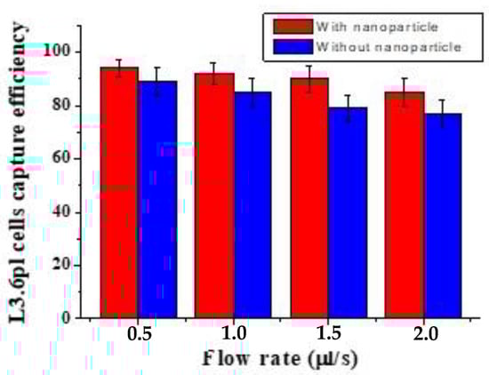 Cells captured in the LFA device under two conditions: with and without gold nanoparticle coated. L3.6pl cells were captured in the LFA device under different flow rates. Error bars show the range (n = 3).